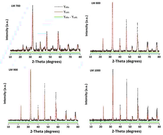 Powder XRD patterns for all the samples are shown in Figure 2. The patterns show peaks for lanthanum manganites, Pm-3m, and Rc structures [LaMnO3 (ICSD-01-075-0440, 01-082-1152)], captured with peaks located at 2θ values of 22.90°, 32. 61°, 40.22°, 46.82°, 58.18°, 68.39°, and 77.86°. The crystallinity of the compounds increased with calcination temperature and the XRD patterns are characteristic for La-based perovskites showing clear, sharp, and well-defined reflections. For LM 700, the unidentified impurity peaks at 21, 36, and 60° 2θ were below and above the perovskite reflection line (110), while the major perovskite lines remained unaffected. The cubic LaMnO3 symmetry, resulting from reducing conditions during synthesis, was visible in LM 700 and LM 800. At a thermal treatment of 800 °C, the low intensity impurity peaks present in the LM 700 sample diminished. Peak profile sharpening, due to crystallite size increase and decrease in lattice strain was observed as the calcination temperature increased [38]. The unit cell of the ideal cubic phase observed in LM 700, indicated by comparison of the axes, transformed to a doublet in LM 1000. The unit cell dimensions listed in Table 1 correlate with the data published in a recent experimental and theoretical paper [39]. Prior to the Rietveld refinement analysis of LM 1000, we observed that the initial cell volume of LM 900 decreased by 0.6 Å3, which can be attributed to a minor error that could arise from using unrefined values to calculate cell volume.