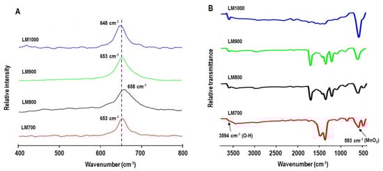 Infrared spectroscopy was performed to investigate the impurity content and chemical bonding states between the lanthanum-oxygen and manganese-oxygen atoms in LaMnO3 samples that produced different structures at different calcination temperatures (Figure 4B). All absorption peaks observed confirmed the polycrystallinity of the LaMnO3 samples. Visible bands observed around 3500–3600 cm−1 and 500–600 cm−1 correspond to the bond stretching vibrations of hydroxyl group (VO-H) and the M–O bond (VM-O) stretching vibrational modes, respectively, which suggest the formation of a metal perovskite oxide framework [42,43].