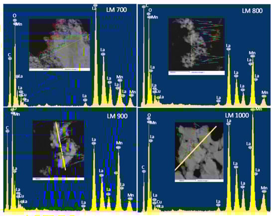 Energy dispersive X-ray analysis (EDX), Figure 6, shows the presence of all the expected elements in the LaMnO3 perovskite. Table 4 gives the respective atomic percentages of the elements in the perovskite samples. In general, EDX results are close to the nominal values, thus confirming the actual composition of the powder samples. The results from electron microscopy images and EDX suggest that the glycol–thermal technique and calcination temperatures influenced the morphology of the LaMnO3 samples. Additionally, the lattice d-spacing was in the range of 0.3–0.4 Å, which shows consistency with the experimental results published by Ortiz-Quiñonez et al. [45].