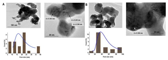 TEM images and particle size histograms of LaMnO3 calcined at (A) 700 °C and (B) 900 °C.