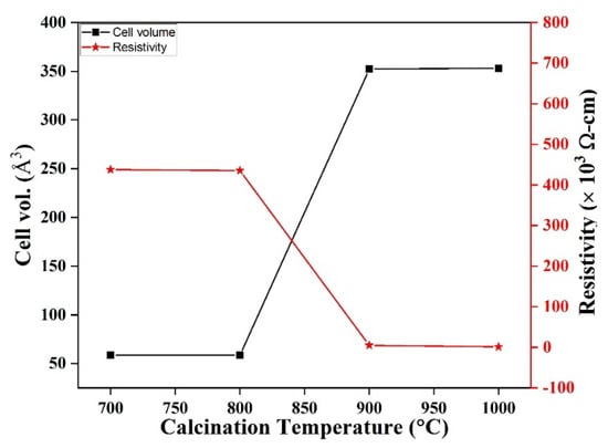 Figure 8 shows the cell volume and resistivity of LaMnO3 calcined at different temperatures. The plot shows that as the calcination temperature and cell volume increased, the resistivity decreased.