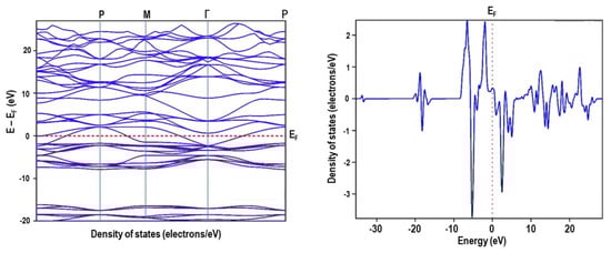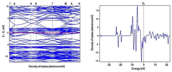 The band structure calculation was performed after the optimization. A high success level was observed in convergence after a certain number of optimizations using the Broyden–Fletcher–Goldfarb–Shanno (BFGS) algorithm, a second order optimization method. Figure 9 and Figure 10 show the cubic and rhombohedral symmetry band structure and density of states for the spins. The k-points in the desired k-paths followed within the zone boundary along the direction of X → Γ → M → Γ→ P and Γ → A → H → K → Γ→ M→ A→ H for cubic and rhombohedral LaMnO3 structures, respectively. For the spin states, the figures show a continuous behaviour of the DOS through the Fermi level which give a metallic characteristic.