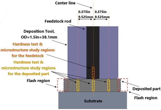 Schematic of the cross-section of the deposited Al2050 part and the feedstock rod, showing the regions chosen for the hardness test and studying the microstructure.