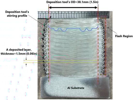 Wrought Al2050-T84 feedstock rods with a square cross-section of 9.5 mm × 9.5 mm (3/8 in × 3/8 in) and a length of 500 mm (20 in) were prepared from large plates using water jet/CNC. Before placing the rods in the AFSD machine, a graphite coating was sprayed on their surface, enabling easier rod movement and preventing the rod from getting stuck in the deposition tool. After setting up the machine and executing the associated G-code, the part was deposited. The deposition parameters, namely, the tool’s rotation speed, the feedstock material feed rate, and the tool’s traverse speed, were held constant to deposit the Al2050 part with a layer thickness of 1.5 mm (0.06 in). The deposited part is composed of thirty layers in the building direction. The part is 228 mm (9 in) in length and the width of the part is 38.1 mm (1.5 in) without considering the flash region, which is equal to the deposition tool’s outside diameter. The part is deposited on a 102 mm × 304 mm (4 in × 12 in), 13 mm (0.5 in) thickness, aluminum alloy substrate plate.