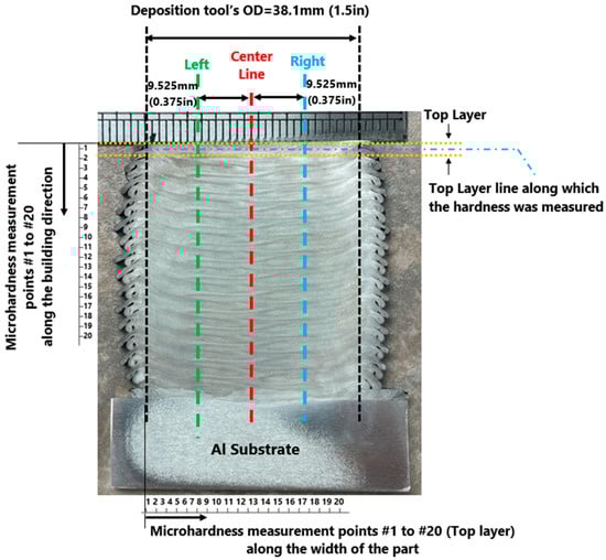 Microhardness measurement points along the building direction for the inner layers and along the as-deposited parts’ cross-section’s width for the top layer.