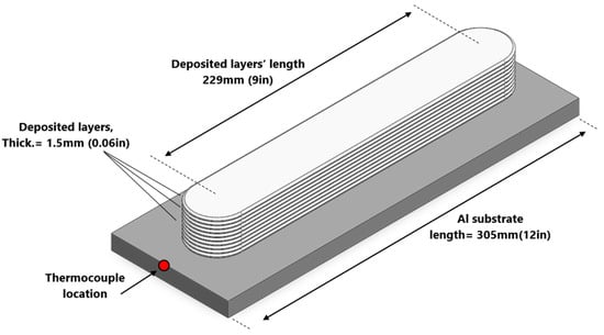 The samples studied in this paper were cut from an as-deposited Al2050 block. The block was printed on a substrate made of aluminum alloy that was 12.7 mm (0.5 in) thick, as shown in Figure 8. Thirty layers were deposited, each layer being 1.5 mm thick (0.06 in). Each layer is deposited along a 229 mm (9 in) long straight line. A thermocouple was installed at the substrate near one end where the deposition starts. The thermocouple readings indicate the temperature at that exact location.