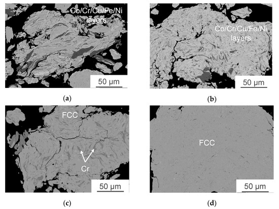 Coarse agglomerated particles were formed from elemental metal powders during the mechanical alloying of Co-Cr-Fe-Ni and Co-Cr-Cu-Fe-Ni powder mixtures. All the used components were ductile, so the structure formation upon MA of powder mixtures took place via the mechanism typical of the “ductile–ductile” systems: upon impact interactions of grinding media, particles were deformed to give rise to new oxide-free surfaces, which formed strong van der Waals bonds with each other [54]. The features of structure formation are discussed in detail for the Co-Cr-Cu-Fe-Ni system (Figure 1). Deformation and agglomeration of initial particles took place during the initial stage of MA. The structure of agglomerates contained easily discernible layers of initial elements. Their thickness, measured by the intercept method, depended on the size of the starting powders and reached 3–5 µm for Fe, Co, and Ni and 20–30 µm for Cr and Cu (Figure 1a). No extensive dissolution of the components was observed, as indicated by the XRD peaks belonging to the corresponding elements (Figure 2, Table 1).
