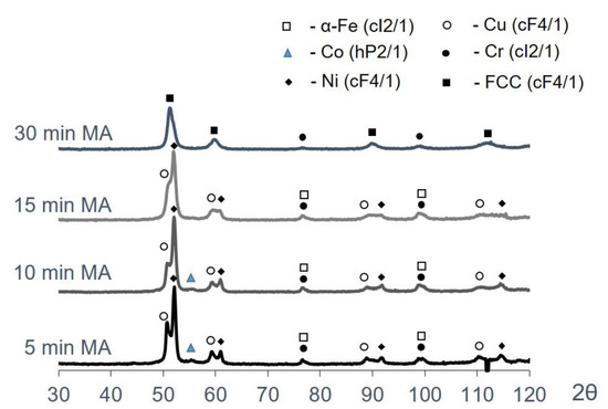 Gradual structure homogenization of composite granules (declining thickness and more chaotic arrangement of the component layers) took place with increasing duration of MA (Figure 1b,c). This stage was characterized by the complete dissolution of the components that had been added as highly dispersed powders (cobalt), as well as by the formation of solid solutions, as indicated by the merging of the XRD peaks belonging to copper and nickel (Figure 2).