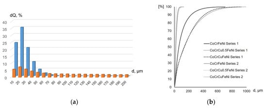 The differential particle size distribution curves of the CoCrCuFeNi powder mixtures before (orange) and after (blue) grinding (a) and integral particle size distribution curves of CoCrCuxFeNi powder mixtures (b).