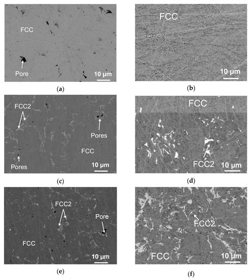 As copper concentration rose to become equiatomic, the content of the FCC2 phase in the alloy increased, which can be seen from the increasing intensity of the peaks of this phase in XRD patterns. The XRD data correlate well with the microstructure of CoCrCu0.5FeNi and CoCrCuFeNi alloys. The FCC2 phase is represented as light-grey grains of irregular shape. The amount of FCC2 grains increases at higher Cu concentrations (Figure 4c–f), as it appears from a larger fraction of white-contrast FCC2 phase in the microstructure image (Figure 4e,f).