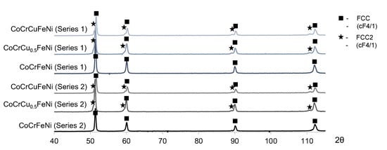 Below, the compact CoCrCuxFeNi samples produced from coarse-grained and fine-grained powders will be denoted “Series 1” and “Series 2”, respectively.