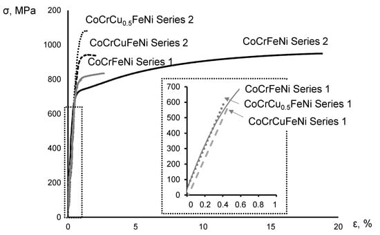 Figure 6 shows the stress–strain curves of the CoCrCuxFeNi alloys manufactured from Series 1 and 2 powders.