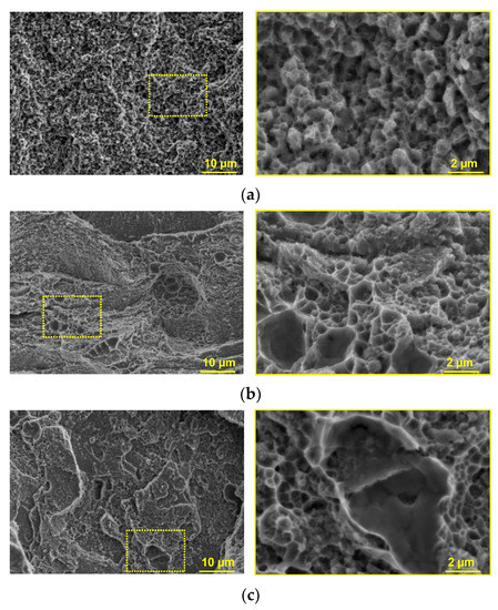 The microstructures of fractures in the CoCrFeNi (a), CoCrCu0.5FeNi (b), and CoCrCuFeNi alloys (c). (The areas highlighted by the yellow rectangles show enlarged images of fractures).