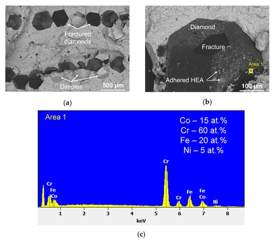 An EDX study of the fractured diamond surface revealed that chromium was the predominant element in the areas of the adhered matrix (Figure 8b,c). It is known that chromium, among all metals contained in the alloy, has the highest affinity for carbon and a tendency to form carbides. It was shown in [51] that chromium, uniformly distributed in an Fe-Co-Ni-Cr powder mixture, forms an intermediate carbide layer at the metal-diamond interface at sintering. Probably, a similar carbide formation also takes place during the hot pressing of diamond with a high-entropy CoCrCuFeNi matrix.