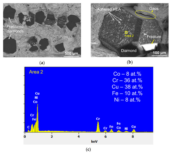 The metal–diamond composites were characterized by high adhesion between the matrix and the single diamond crystal for both HEAs. Figure 8a and Figure 9a indicate that the main crack was propagating not only along the metal–diamond interface (which seems to be the most vulnerable area in the composite) but also in the grain body of some single crystals. Furthermore, the matrix tightly adjoined the diamond single crystal without any gaps (Figure 8b). This fact demonstrates that adhesion strength at the metal–diamond interface formed by van der Waals forces and chemical interactions between the structural components was comparable to the strength of a single diamond crystal.