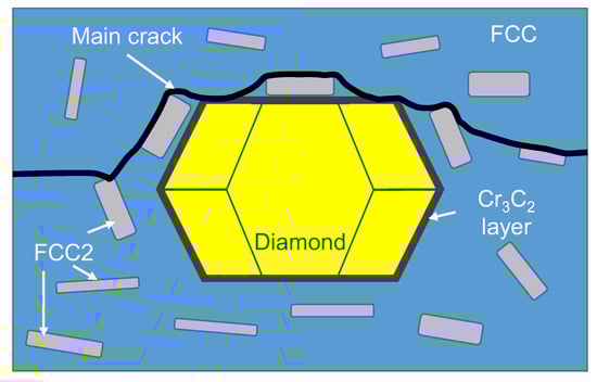 A schematic diagram of the crack trajectory in the metal–diamond composite with CoCrCuFeNi binder.
