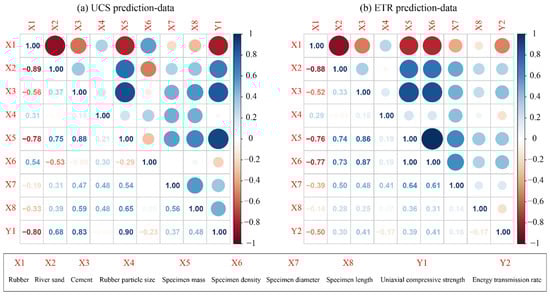 It should be noted that each specimen is independent and non-repetitive, such as composition content (rubber particle with different size, river sand and cement), physical properties (mass and density) and size (diameter and length). The detailed information of the considered parameters is listed in Table 3 and Table 4. Nevertheless, not all parameters are favorable for predicting the UCS and ETR of the novel concrete material. The results of parameter correlation analysis are shown in Figure 2. As illustrated in Figure 2a, the correlation between rubber, river sand, cement and the specimen mass is significantly higher than that between other parameters and is close to 1, respectively. Thus, the specimen mass (M) should be removed to reduce the calculation time for predicting the UCS. On the other hand, the correlation between the M and specimen density (r) and most other parameters is not low, especially the rubber (R), river sand (S) and cement (C) for predicting the ETR (see Figure 2b). In addition, the R and S are negatively correlated, and the correlation values are high in both the UCS prediction and the ETR prediction data sets, but the reason for this result is that the rubber and river sand are taken as important components of this novel material in the form of combination. For example, concrete with low rubber content may lead to insufficient elasticity and require more river sand to increase its strength. Therefore, neither the rubber nor river sand can be deleted in this study.