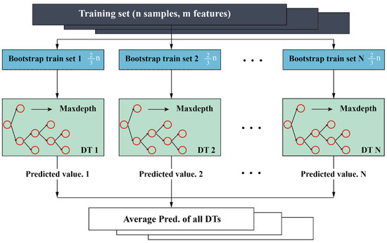 As illustrated in Figure 3, the number of trees (Nt) and the random features (Maxdepth) are the main hyperparameters that affect its prediction performance. Although the increase of the Nt will not cause the overfitting of the model, it is difficult to obtain satisfactory predictive performance through the time-consuming manual debugging of hyperparameters’ combinations [38,39].