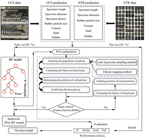 Two improved optimization algorithms consisting of Latin hypercube sampling-POA (LHSPOA) and chaotic mapping-POA (CMPOA) are used to optimize the RF model for predicting the UCS and the ETR of a novel aseismic rubber-concrete material in this study. As illustrated in Figure 4, the framework of using the proposed models to predict the aseismic performance of the novel concrete material can be organed in three parts: (a) Building the database—as mentioned in Section 3, 70 samples were used to predict the UCS of this novel aseismic concrete material, and another 70 samples were used to predict the ETR. Whether the UCS or the ETR prediction, the ratio of the train set to the test set is four to one. It should be noted that all data is normalized to [−1, 1] to eliminate the data discrepancies; (b) Developing prediction models—the POA and the improved POA were combined with an RF model to generate different prediction models, i.e., POA-RF, LHSPOA-RF and CMPOA-RF. The population size is a key factor affecting the optimization algorithm’s performance [55,56], which is set as 20, 40, 60, 80 and 100 to explore the potential of the model. The iteration is 200 and the RMSE is considered as a fitness function to determine the optimal population size. For the RF model, the ranges of Nt and Maxdepth are (1, 100) and (1, 10), respectively; (c) Performance evaluation—four statistical indices were used to evaluate the predictive performance of the proposed hybrid RF models.