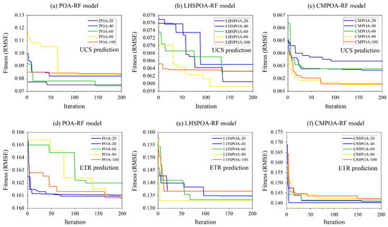 To determine the best population size of each prediction model, the fitness values of each model with five types of population are calculated during 200 iterations. The development results of the proposed models for predicting the UCS of the novel aseismic concrete material are shown in Figure 5a. The best population size of the POA-RF model is 60 by means of the lowest value of the fitness. The LHSPOA-RF model and the CMPOA-RF model obtained the lowest values of fitness when the numbers of the population size are both 80, as shown in Figure 5b,c. However, it should be noted that the fitness values of the best LHSPOA-RF model and the best CMPOA-RF model are lower than the POA-RF model (see Table 5). As illustrated in Figure 5d, the POA-RF model with a population size of 40 achieved a lower fitness value than other models for predicting the ETR of the novel aseismic concrete material. Compared with the best POA-RF model, the most satisfying population sizes of the LHSPOA-RF model and the CMPOA-RF model are 80 and 40, respectively (see Figure 5e,f). As a result, the optimal hyperparameter combinations of RF models based on the three optimization algorithms for predicting the UCS and the ETR are listed in Table 5.