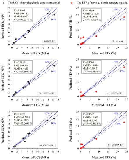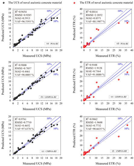 The regression diagrams of the proposed hybrid RF models using the test set are shown in Figure 7. For the UCS prediction, the LHSPOA-RF model has achieved the most satisfactory performance by means of the most points located on the perfect line or closer to it than other models as illustrated in Figure 7b. As shown in Figure 7a,c, the predictive performance of CMPOA-RF is still better than the POA-RF by means of fewer points out of the 10% line. On the other hand, the predictive performance of the proposed models for forecasting the ETR is obviously worse than that of the UCS as shown in Figure 7d,e. However, the regression results showed that the LHSPOA-RF model and the CMPOA-RF model still have better performance than the POA-RF model resulting in the superior performance indices and more effective points close to the perfect line, especially the LHSPOA-RF model. As a results, two improved POA-RF models (i.e., the LHSPOA-RF model and the CMPOA-RF) are considered to be the superior predictors, rather than the initial POA-RF model, in predicting the UCS and the ETR of the novel aseismic rubber-concrete material in this study.