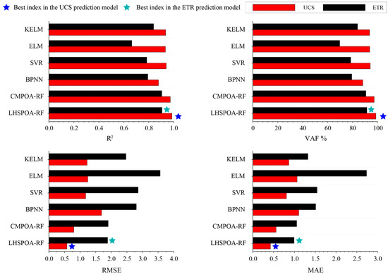 However, the performance evaluation of the model in the training phase is not enough to prove its real prediction performance, especially as it is applied to predict unknown data. Therefore, the test set is responsible for verifying the performance of the proposed models for predicting the UCS and the ETR. Table 7 shows the performance evaluation results of all the models in the testing phase. Compared with the performance results obtained using the ETR dataset in the training phase, the performance indices of each model are somewhat worse, but not by much. The result indicates that the adverse overfitting phenomenon does not appear in the proposed models, which suggests that the proposed model is accepted and may be applied to practical engineering. Furthermore, the LHSPOA-RF model is still the best prediction model for forecasting the UCS and the ETR resulting in the highest values of R2 (0.9857 and 0.9065) and VAF (98.5909% and 91.3652%), and the lowest values of RMSE (0.5781 and 1.8814) and MAE (0.4233 and 0.9913). After the LHSPOA-RF model, the CMPOA-RF model has better performance indices than the POA-RF model for predicting the UCS and the ETR.