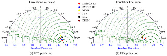 The Taylor diagrams of all models for predicting the UCS and ETR of novel material.