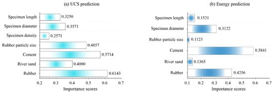 Although the best prediction model has been determined through performance evaluation, the input parameters’ importance for predicting the UCS and the ETR is unknown. Therefore, the PAWN method proposed by Pianosi and Wagener [63,64] is utilized to conduct sensitive analysis based on the LHSPOA-RF model. The parameter importance results are shown in Figure 10. As demonstrated in Figure 10a, rubber is the most important input parameter with a score of 0.6143 for predicting the UCS of the novel aseismic rubber-concrete material. After this parameter, cement (0.5714), rubber particle size (0.4857) and river sand (0.4009) have higher importance scores than specimen diameter (0.3571), specimen length (0.3250) and specimen density (0.2571). For the ETR prediction (see Figure 10b), the cement has the highest importance score of 0.5841 among all the input parameters. The values of rubber and specimen diameter were significantly higher than the other parameters, i.e., rubber (0.4256), specimen diameter (0.3122), specimen length (0.1521), river sand (0.1365) and rubber particle size (0.1123).