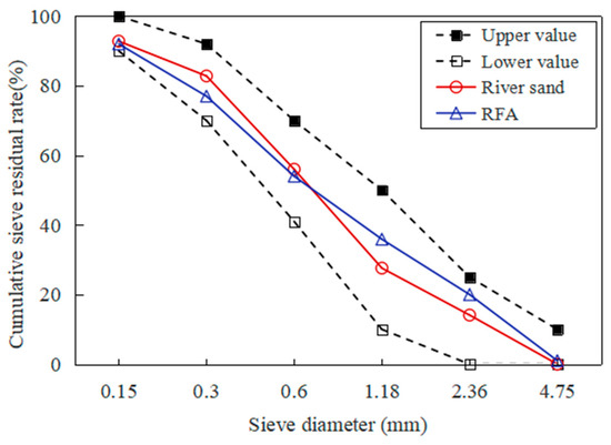 A total of 11 concrete mixtures were prepared for this study. On the one hand, four kinds of RFA replacement rates were selected to investigate the influence of the RFA replacement rate on the performance of RFAC: 0%, 25%, 50%, 75%, and 100%, respectively. Mixtures prepared with OPC and RFA were designated as Rα, where α is the RFA replacement rate (0%, 25%, 50%, 75%, and 100%). For example, R0 is the concrete with 0% RFA, which is the natural aggregate concrete and serves as the control group. Furthermore, R25 is the concrete with 25% RFA. On the other hand, mixtures were prepared by 100% RFA and a different number of mineral admixtures to investigate the improvement effect of mineral admixtures on the performance of RFAC, which are designated as RFβ, RSγ, and RFβSγ, respectively. R, F, and S stand for RFA, fly ash, and silica fume, respectively. Alternatively, β and γ stand for the mass replacement rate of fly ash and silica fume, respectively. According to previous studies [22,23], two replacement rates of fly ash (10% and 20%) and two replacement rates of silica fume (5% and 10%) were selected in this study. In order to ensure workability, extra water was added to the concrete mixtures because of the water absorption by RFA and was calculated by multiplying the mass of RFA by its water absorption rate. Concrete mixtures were designed for a compressive strength of 40 MPa and the mixture proportions are presented in Table 3. The grading curves of RFA and river sand are shown in Figure 1.