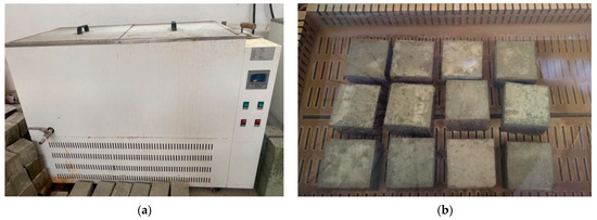 Drying–wetting cycle: (a) apparatus for soaking specimens; (b) part of specimens immersed in the chloride solution.