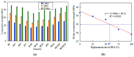Compressive strength is considered the most significant property of concrete. Figure 3a shows the compressive strength of all types of concrete, at all ages. There is a marked drop in the compressive strength of RFAC, especially at early ages, while the decline in the compressive strength of concrete with a higher RFA replacement rate is greater. After curing for 28 days, the compressive strength of R0 is 45.2 MPa, and the compressive strength of R25, R50, R75, and R100 is 3.3%, 5.8%, 17.0%, and 22.1% lower than that of R0, respectively. Figure 3a also shows that the strength obtained for concrete with mineral admixture and 100% RFA is higher than that of R100 at all ages. Compared with R100, the 28-day compressive strength of RF10, RF20, RS5, and RS10 increases by 4.5%, 10.5%, 7.4%, and 16.5%, respectively, while the 28-day compressive strength of RF10S5 and RF20S10 increases by 19.6% and 26.4%. As observed, the composite incorporation of fly ash and silica fume can improve the compressive strength of concrete more effectively than a single incorporation. In particular, concrete made with 20% fly ash and 10% silica fume provides comparable compressive strength to that of R0. As shown in Figure 3b, a linear relationship is indicated between the 28-day compressive strength of RFAC and the RFA replacement rate. Moreover, the fitting results show that the compressive strength of concrete without a mineral admixture cannot reach 40 MPa when the RFA replacement rate exceeds 57%.