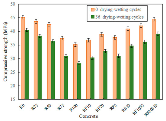 Figure 4 shows the compressive strength of each concrete exposed to 0 and 36 drying–wetting cycles. It should be noted that the compressive strength in Figure 4 exposed to 0 drying–wetting cycles is the 28-day compressive strength in Figure 3. The compressive strength of RFAC with a higher replacement rate of RFA has a greater reduction after 36 drying–wetting cycles. For example, the compressive strength of R0 decreases by 10.4% and that of R100 by 19.6%. The reduction of the RFAC compressive strength with mineral admixtures is smaller than that of R100, while RF20S10 has the smallest compressive strength loss (12.3%) among them, followed by RF10S5 with 14.2%.