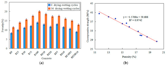 (a) Porosity of concrete after drying–wetting cycles; (b) a fit curve between compressive strength and porosity of concrete after 36 cycles.