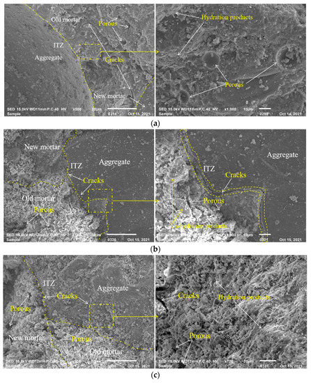 The microstructures of the concrete specimens are the fundamental reason for the performance of concrete. SEM images of RFAC with different RFA replacement rates after 36 drying–wetting cycles are shown in Figure 8.