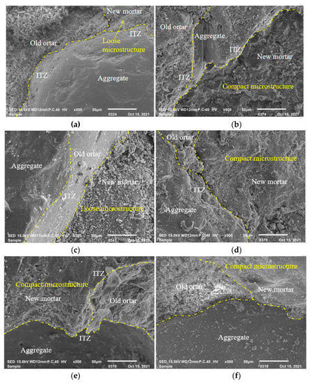 Loose structure and poor quality of ITZs are the essential reason for the low compressive strength and poor chloride penetration of RFAC. The SEM images of RFAC with 100% RFA and a mineral admixture after 36 drying–wetting cycles are shown in Figure 9. As shown in Figure 9a,c, there are a lot of pores and microcracks in the specimens prepared with 10% fly ash or 5% silica fume, respectively. As the content of fly ash or silica fume increases, the microstructure of RFAC shows a dense trend, and there are fewer microcracks and pores in the structures of RF20 and RS10. In addition, the quality of the ITZs gradually improves, and stronger bonding of the fine aggregate and mortar is observed, as shown in Figure 9b,d. The microstructure of RFAC becomes denser when fly ash and silica fume are incorporated simultaneously (Figure 9e,f). There are only a few pores in the adhesive mortar and ITZs, which are filled with hydration products.
