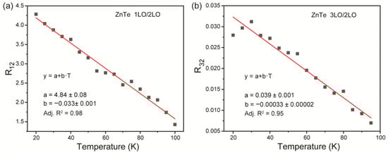 Careful analysis of thermally induced change of ZnTe Raman spectra shows that ratiometric technique between different observed vibrational lines can provide contactless temperature sensing. For example, the intensity ratio between 1LO and 2LO intensities (R12) can be utilized as a temperature-dependent parameter for optical thermometry. The experimental values of R12 as a function of temperature are presented in Figure 2a. The observed R12 temperature dependence can be accurately fitted by a pseudo-linear function with suitable quality Adj. R2 = 0.98, which facilitates defining temperature from the calculated ratio. Another temperature-sensitive parameter proposed is the intensity ratio between 3LO and 2LO lines—R32. Similar to the former case, R32 experimental values were approximated with a linear function with slightly worse quality. Both ratiometric approaches prove the possibility of using Raman spectra of ZnTe for optical thermal sensing. However, R12 provides thermometry within the temperature range of 20–100 K, whereas R32 allows thermal sensing in the region of 20–95 K. This fact could be explained by an indistinguishable intensity of the 3LO mode at 100 K.