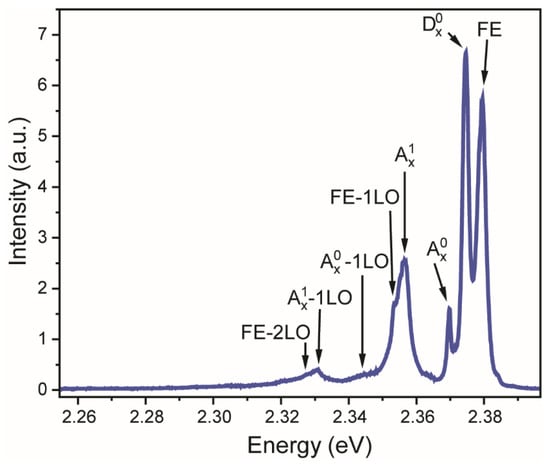 In addition to Raman spectroscopy, luminescence measurements are widely known as one of the most perspective methods to provide contactless optical thermometry. Zinc telluride is a direct band semiconductor with a 2.26 eV band gap [40,41]. The valence band consists of two sub-bands with different effective masses; however, the maxima corresponding to the light-hole and heavy-hole excitons cannot be observed in low-temperature photoluminescence spectra of bulk and thick ZnTe films. Figure 3 displays ZnTe emission spectra upon 514 nm excitation measured at 20 K. We focused on ZnTe exciton luminescence bands as these lines undergo the largest thermally induced change. All observed emission bands are ascribed to the corresponding transitions (Table 1).