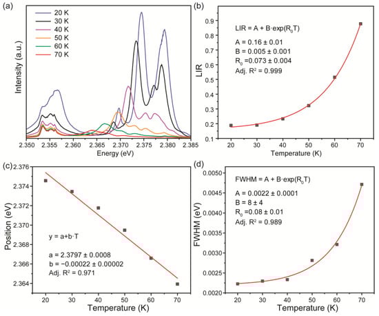 Further, emission spectra of the ZnTe sample were measured at different temperatures (Figure 4a). One can see significant thermal quenching of both FE-1LO and bands accompanied by a red shift of the latter one, along with a temperature increase. The spectroscopic parameters of emission bands, including intensity and line position, were obtained from the deconvolution procedure, which was performed for each temperature. The best fit was obtained by using the Voight line shape for both bands. The luminescence intensity ratio between the FE-1LO and transitions was proposed as a temperature-dependent parameter for optical thermometry. As can be seen from Figure 4b, LIR could provide temperature sensing within the range of 20–70 K. The experimental data were successfully fitted with an exponential function: , where B, C, and R0 are temperature-independent constants. The approximation used should be considered a phenomenological function.