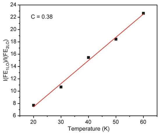 According to the observed data, the temperature dependence of free exciton first and second phonon replica intensity ratio linearly increases within the range 20–60 K (Figure 5). Similar data were acquired for gallium nitride, cadmium sulfide, and cadmium selenide [50,51]. In the case of free exciton radiative annihilation, only phonons with the wave vector close to the zero point participate in an interaction with excitons. However, considering the second phonon replica, the sum of two phonons wave vectors must be close to zero in order to interact with excitons. Along with the temperature increase, a bigger number of phonons in the first replica participate in the radiative annihilation, while the number of phonons corresponding to the second replica remains unchanged. Therefore, an equation could be derived , where T is temperature, and C is a coefficient, characterizing the grown layers quality. The obtained value C = 0.38 makes one conclude that synthesized ZnTe samples have a rather suitable quality [51].