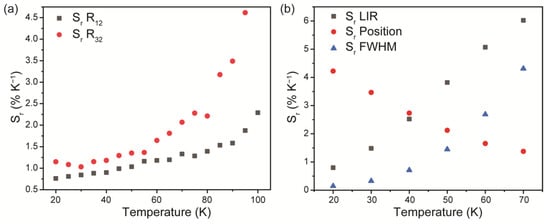 Thermometric performances of the studied ZnTe thermometer were assessed in terms of relative thermal sensitivity and temperature resolution. Relative thermal sensitivity, Sr, was introduced to provide a fair comparison between various types of thermometers irrespective of their nature (e.g., mechanical, electrical, optical). Sr could be obtained using the following equation: , where Λ is the monitored temperature-dependent parameter. Thermal sensitivity depends on temperature, so Figure 6 shows Sr values calculated for different proposed sensing parameters as a function of temperature. It can be seen that relative thermal sensitivity increases with temperature growth, except for thermometry, based on the position of the spectral line. The best Sr value of 6.0% K−1@70 K was achieved using LIR as a temperature-dependent parameter.