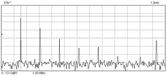 In Figure 9, Figure 10, Figure 11, Figure 12, Figure 13, Figure 14, Figure 15, Figure 16, Figure 17, Figure 18 and Figure 19 are plotted the experimental amplitude spectra obtained for the measured vibrations of device with additional mass of 0.620 kg, recorded after different moments of the fatigue test. In the second stage of resonance fatigue testing, the evolution of structural degradation was more rapid than in the first stage and the results could have been affected by the relatively long time required for recording the frequency response functions by frequency sweeping. The amplitude spectra are almost instantaneously displayed after the end of recording the vibration time histories. The results are calculated in decibels voltage values (dBV) relative to the reference specified in the upper left side of plots. The sequence of the plots recorded in the second stage illustrates better the fatigue resonance methodology than those recorded in the first stage, due to the higher gradient of structural degradation.