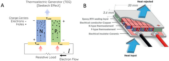 Representation of a thermoelectric generator: (A) Flow of charge carriers in a pair of n- and p-type leg pair; (B) schematic of thermoelectric generator module [12,13].