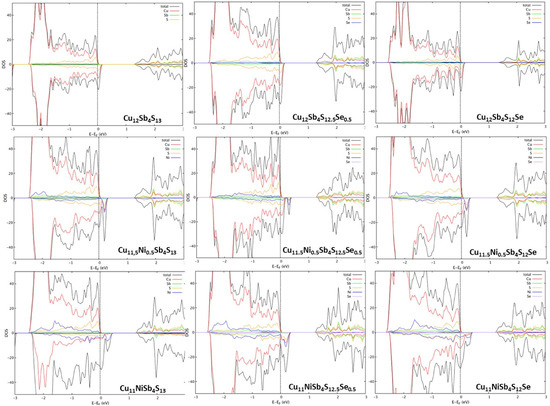 The density of states of some of the compositions, calculated with spin polarization, are presented in Figure 2. The ternary tetrahedrite (Cu12Sb4S13) converged in a non-magnetic solution, and since the Fermi level resides below the top of the valence band complex, it can be described as an almost metallic heavily doped p-type semiconductor. After doping with Ni, the band gap reduces, and tetrahedrite becomes increasingly more conductive, also displaying a ferromagnetic behavior. The valence band moves above the Fermi level with spins down, as Ni is a known ferromagnetic material, which explains why the spin asymmetry increases with Ni doping. Additionally, since Ni2+ has an electronic configuration of [Ar]3d8, which contrasts to Cu2+ with an electronic configuration of [Ar]3d9, doping results in one less electron, or, in other words, in one more “hole”, that increases the number of states available below the Fermi level.