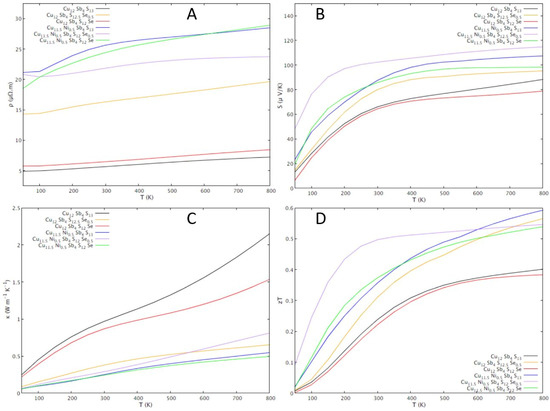 BoltzTrap simulations of the temperature dependence of thermoelectric properties of tetrahedrite with different dopant contents following the formula Cu12−xNixSb4S13−ySey (0 ≤ x ≤ 1.0; 0 ≤ y ≤ 1.0): (A) Seebeck coefficient; (B) electrical resistivity; (C) thermal conductivity; (D) figure of merit, zT.