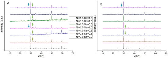 Powder X-ray diffractograms of Cu12−xNixSb4S13−ySey samples ((A) as-cast and (B) annealed). Arrows indicate peaks of secondary phases: green for covellite (CuS) and blue for famatinite (Cu3SbS4).