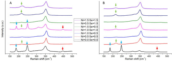 Raman spectra of Cu12−xNixSb4S13−ySey samples after casting (A) and after annealing (B). The peaks pertaining to the tetrahedrite phase are located in the 315 and 348 cm−1 shifts. Arrows indicate the peaks not related to the tetrahedrite phase: green arrows—the Cu-S chemical bond of ejected material; blue arrows—the Sb-S chemical bond of ejected material; and red arrows—the Anilite (Cu7S4) secondary phase.