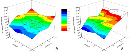 Lattice parameter dependence on Ni content (x) and Se content (y) in as-cast (A) and annealed (B) Cu12−xNixSb4S13−ySey samples.