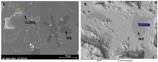 The SEM observation of Cu12−xNixSb4S13−ySey samples often indicates the presence of other phases in addition to the matrix: a darker one, frequently with a star shape and composed of copper and/or nickel sulfides, (Cu,Ni)xSy; and an intergranular lighter phase, mainly composed of chalcostibite-pribramite, CuSb(S,Se)2. The number and size of observed phases significantly decrease after annealing, with some compositions being monophasic. A SEM image of a typical Cu12−xNixSb4S13−ySey sample is presented in Figure 7.