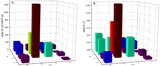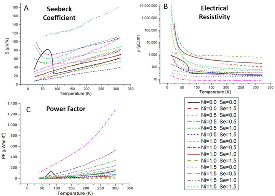 The PF at 300 K as a function of composition is presented in Figure 10A. Overall, the present results show that doping with both Ni and Se can improve the thermoelectric properties of tetrahedrite, generally resulting in higher PFs.