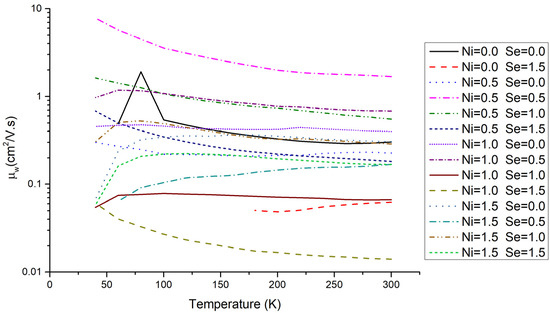 The weighted mobility as a function of temperature for the Cu12−xNixSb4S13−ySey samples studied in this work is presented in Figure 9. Several conclusions can be taken from this data: (i) the values of the weighted mobility are small when compared with other good thermoelectric materials [53]; (ii) the progression of weighted mobility with temperature is sample dependent; (iii) the highest weighted mobility values are generally achieved when the Ni or Se stoichiometry is around 0.5–1.0.
